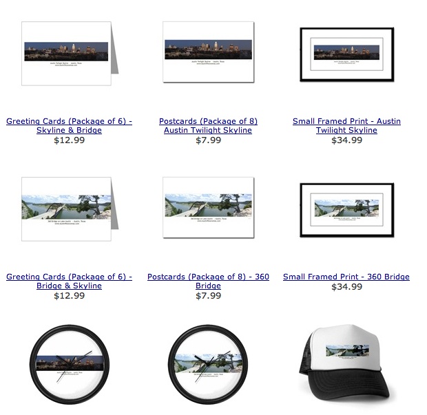 You can now get merchandise from our Austin Panoramas scenic photo collection. Photos were taken in Austin, Texas and surrounding areas by Rich Love. You can order mouse pads, apparel, caps, mugs, tote bags, postcards and framed photos.