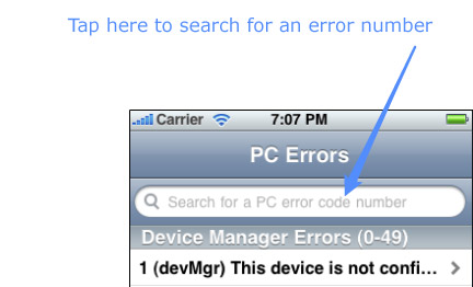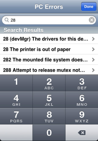 PC Code Sleuth includes PC system error codes in a range from 1 to 15301 It also includes device manager errors from 1 to 49. Those errors are listed as (devMgr) in PC Code Sleuth. If you do a search for an error number between 1 and 49, you will see two results listed. One is a device manager error and the other is a system error. Numbers above 49 should be unique. Programmers can use their own error codes which may be different than system error numbers or device manager numbers. Those numbers are not included in PC Code Sleuth. Carnation Software does not provide support for nor guarantee search results for error codes found on the web with PC Code Sleuth. In other words, we are not going to troubleshoot your PC for you. But there is a wealth of knowledge on the web and we hope to point you in the right direction with our Advanced Google searches. Searching for Error Numbers Tap the Searchbar and a numeric keyboard will pop up to let you enter error numbers.