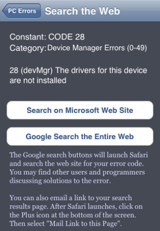 After you enter the search number, tap on the item found to open up the "Search the Web" screen. There you will see a description of the error. Click on one of the search buttons to search the web for a solution to the error.
