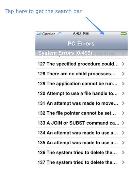 If you are scrolling through the large list of errors and decide that you want to do a search instead, you can tap at the top of the screen to make the searchbar appear.
